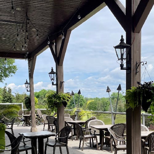 A large part of the experience at Dave’s Pub & Grill is out on our partially covered patio! This space provides an awesome space to sit down to a meal or to catch up with friends or family over a drink! The patio features breathtaking views overlooking the Oakwood 9 Golf Course and the turquoise blue pond that is reminiscent of the waters found at some of the most sought after tropical destinations in the world.